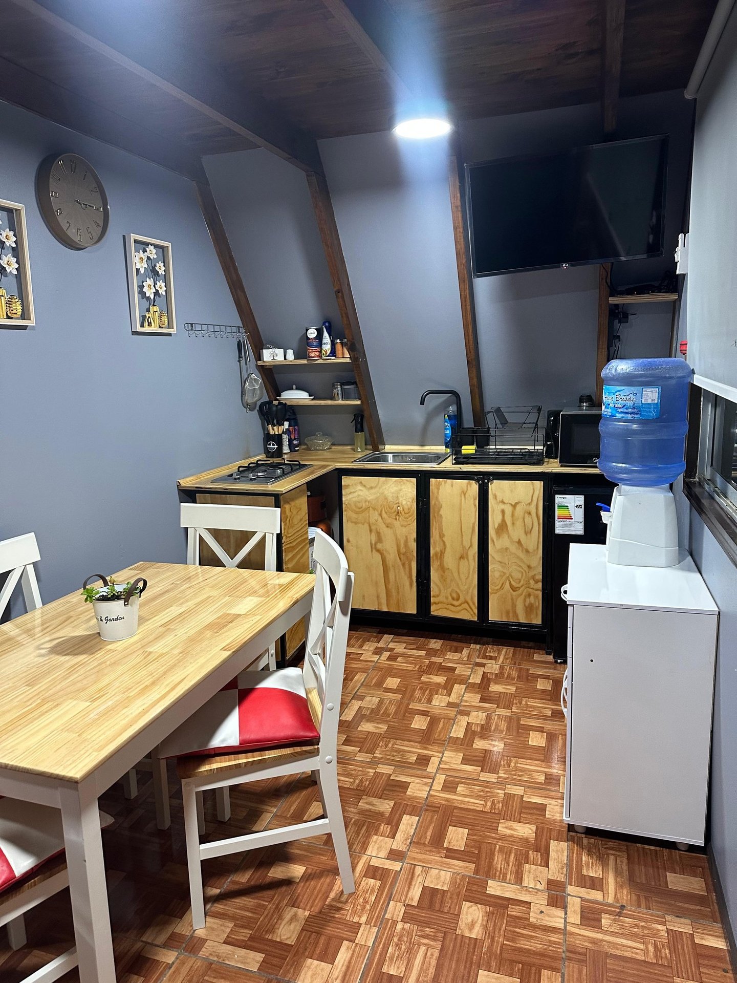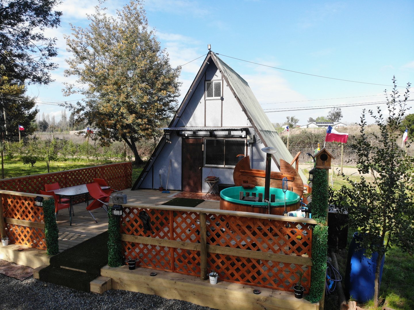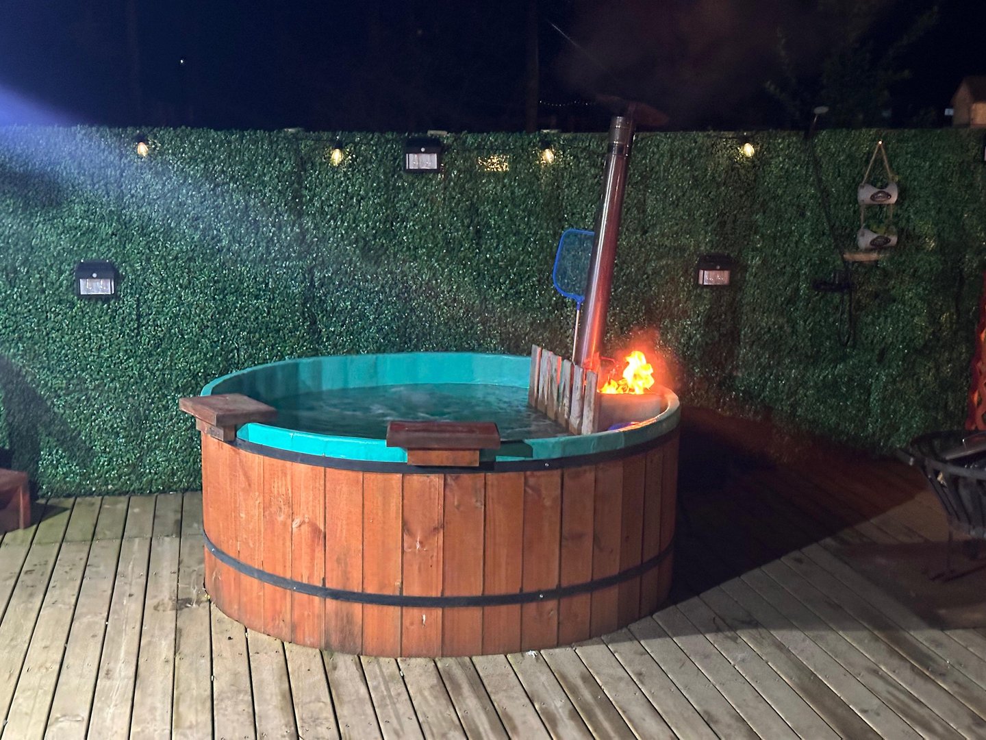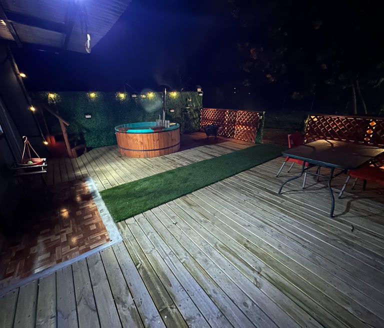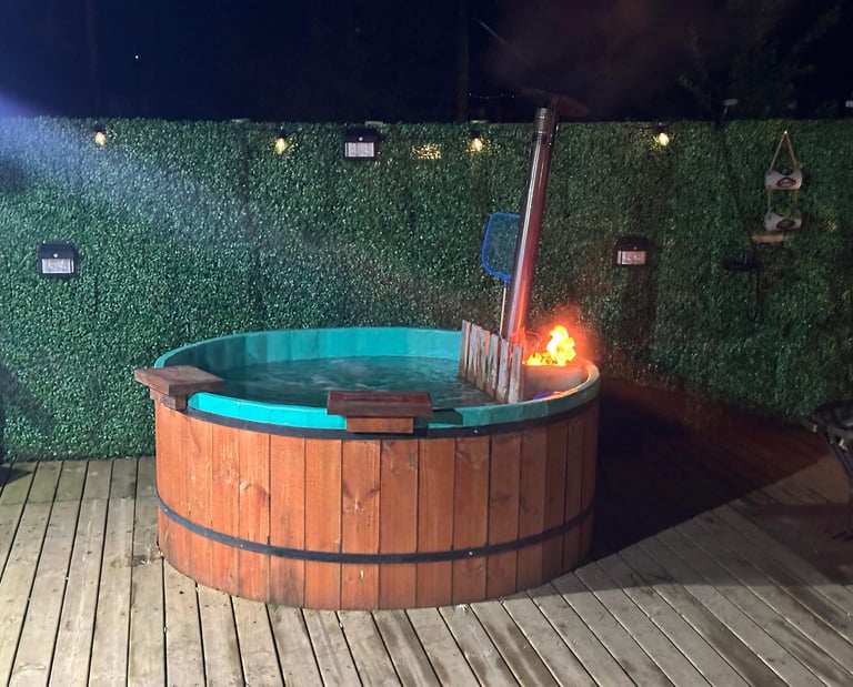 Tinaja a leña con hidromasaje disponible 24/7. Sumérgete bajo las estrellas mientras el bosque te envuelve.